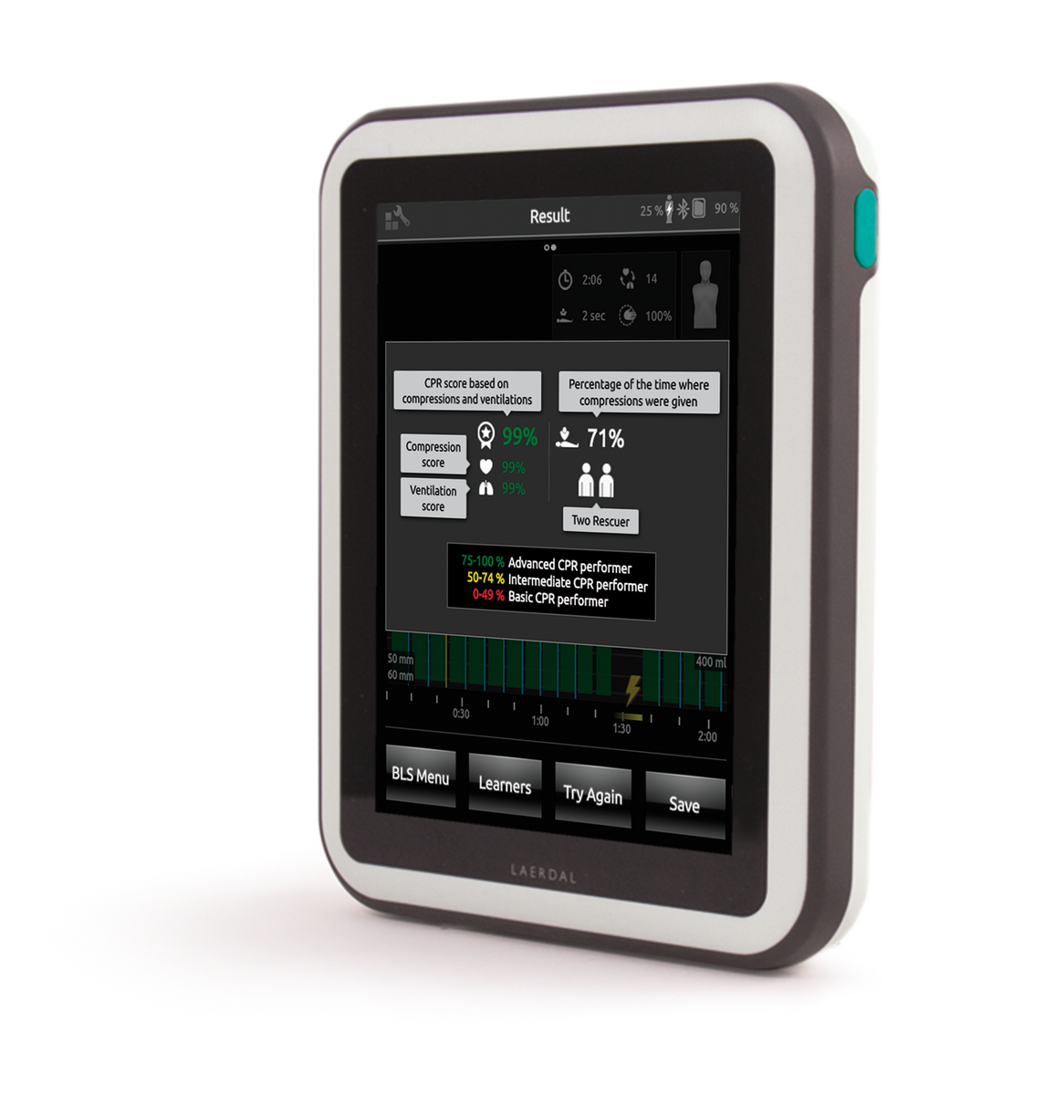 Unitate mobilă de feedback și monitorizare tip tabletă pentru manechine QCPR. Afișează date în timp real privind adâncimea compresiei, frecvența, ventilația și sincronizarea, permițând evaluarea obiectivă a cursanților prin calculul scorului de performanță.